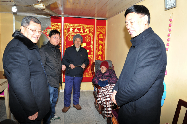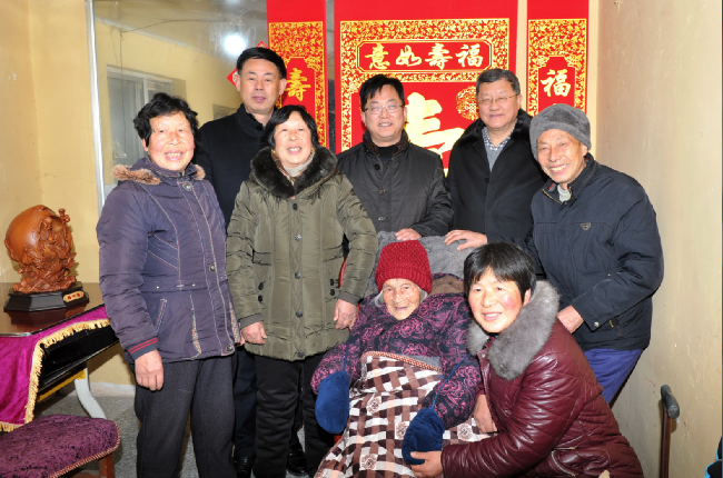 “我們黨政工領導來給您拜年了!”王進強一進門就對坐在沙發上的百歲老人說。
