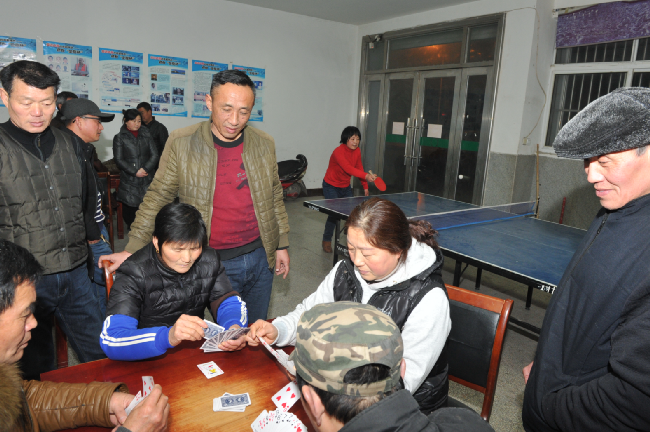 夜晚散步,一跨進位于江蘇農墾淮海農場城東居委會活動室內,頓感這里人聲鼎沸,暖意融融。這邊乒乓球在球拍來回推擋中眼花繚亂,抽殺正酣,那邊一溜排開的3張桌子上擠滿了人,玩著爭上游、摜蛋等撲克游戲。