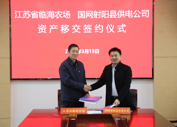 3月15日,江蘇省臨海農場與國網江蘇省電力有限公司射陽縣供電分公司在農場綜合樓七樓會議室舉行電力資產移交簽約儀式,農場黨委書記、場長賀在銳,射陽縣供電分公司總經理王愛軍在資產移交協議上簽字,標志著農場分離辦社會職能改革進入實質性階段。