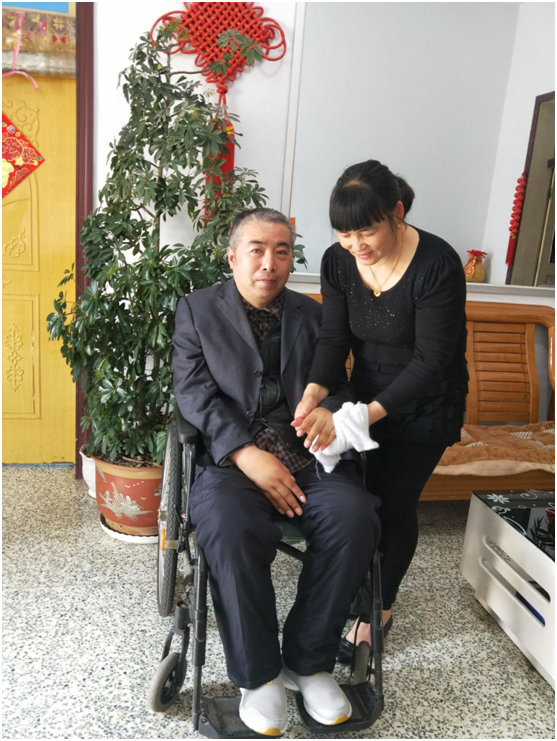 2003年1月2日早晨,一場意外的到來徹底打碎了苗新平平靜祥和的生活,丈夫王慶中在東灘工區(qū)爬電線桿進(jìn)行電工作業(yè)時(shí),不慎從高處跌落,導(dǎo)致頸椎嚴(yán)重摔傷,突如其來的打擊猶如晴天霹靂,經(jīng)過一個(gè)多月的搶救,丈夫的性命總算保住了,卻落下了四肢癱瘓后遺癥,日常起居只能靠坐輪椅。經(jīng)殘疾鑒定,王慶中為肢體殘疾一級(jí)。為了專心照顧丈夫,苗新平辭去了工作,給丈夫治病家里的積蓄很快都花完了,還欠了一屁股的債。盡管內(nèi)心忍受著巨大的煎熬,但她每天還是面帶微笑開導(dǎo)、安慰丈夫,哄他開心。癱瘓?jiān)诖驳恼煞蛏畈荒茏岳恚赀~體弱的公婆也需要有人照顧,這讓苗新平憧憬的幸福夢變得支離破碎。然而,生活中的不幸并沒有壓垮苗新平,反而讓她更加堅(jiān)強(qiáng)地面對(duì)生活,重新?lián)P起生活的風(fēng)帆。從此,當(dāng)別人早已進(jìn)入夢鄉(xiāng)的時(shí)候,苗新平還在忙著收拾家務(wù);當(dāng)別人睡眼朦朧地醒來,苗新平早已為家人準(zhǔn)備好了飯菜。由于丈夫長期癱瘓?jiān)诖玻笮”闶Ы钌贤耆荒茏岳恚浑x不棄,不厭其煩,精心侍候,每天總是按時(shí)為丈夫擦背按摩、端屎端尿、喂飯喂藥、翻身擦洗,為了減輕丈夫的病痛、消除心理壓力,天氣好的時(shí)候,苗新平還經(jīng)常推著坐在輪椅上的丈夫到公園或周邊轉(zhuǎn)轉(zhuǎn),夫妻兩人溫馨默契。十五年來,在苗新平的精心照顧下,丈夫全身沒起過褥瘡,沒生過痱子,沒摔過跤,還慢慢地長胖了。