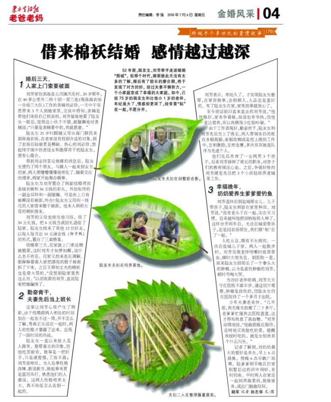 在今天出版的東方生活報四版《金婚風(fēng)采》欄目上,全版刊登了淮海農(nóng)場退休老人陸友生和劉芳結(jié)婚52年來的愛情故事,這也是該欄目今年以來,第7次以整版的文字和圖片形式,刊載淮海老人的愛情故事。現(xiàn)轉(zhuǎn)摘東方生活報上這篇金婚故事,讓大家一睹為快。