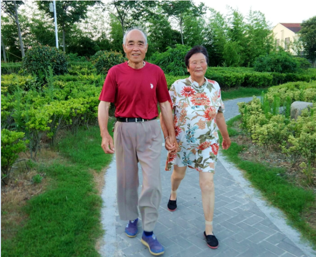 故事的主人公名叫施學兵,今年77歲。妻子叫吳炳如,小他兩歲,他們住在射陽縣淮海農場振興小區一間簡陋的房子里。每天傍晚他倆都要來公園里兜圈,并牽手走上六七公里路程,然后再到公園內的器材上拉伸鍛煉,舒展下筋骨,這對恩愛夫妻成為淮海公園內的一道美麗風景。