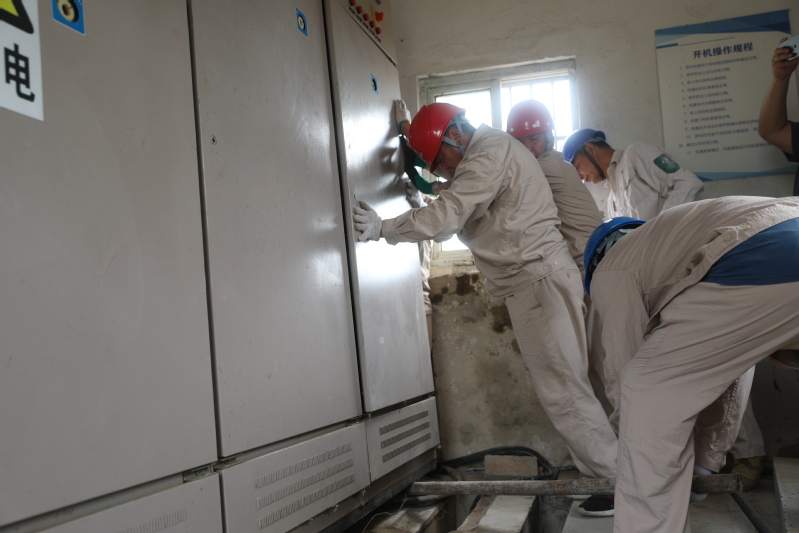 7月5日上午6點10分?!皸铌牥?,8隊南電站不工作了!”接報后,凱惠電力寶應湖分公司負責人楊加春立即組織3名電工趕到現場。經排查,是電站開關柜壞了。落實開關柜、組織材料,他們兵分兩路共同推進。十余個電話打過后,趙愛華終于在農機庫找到一臺型號匹配的開關柜。8點趙愛華等將登高工具、絕緣棒、電纜等材料運到電站。電工邵榮祥戴上安全帽,用絕緣棒將三相開關斷開,率先爬上高壓電桿,又和電工趙愛華、劉福相一起將壞電柜上的控制開關線一一拆除。不足9平方的泵房里,悶熱狹小,壓得人透不氣來,地處田間雜草叢中,蚊蟲直撞人臉,他們全然不顧,全神投入搶修,不一會兒就大汗淋漓。拆除后,他們又與8隊工人一起把新柜抬進泵房。200多斤開關柜死沉死沉,狹小的空間嚴重限制作業,一不小心趙愛華的手肘撞在了電柜上,一陣鉆心得痛。終于把柜子擺到合適位置,接線、拉電纜,電工們立即展開。11點,邵榮祥再次爬上高壓電桿,推上開關,啟動控制,電站發出隆隆的歡唱。此時,溫度計顯示的室外溫度達到了43攝氏度,電工們已全身濕透。