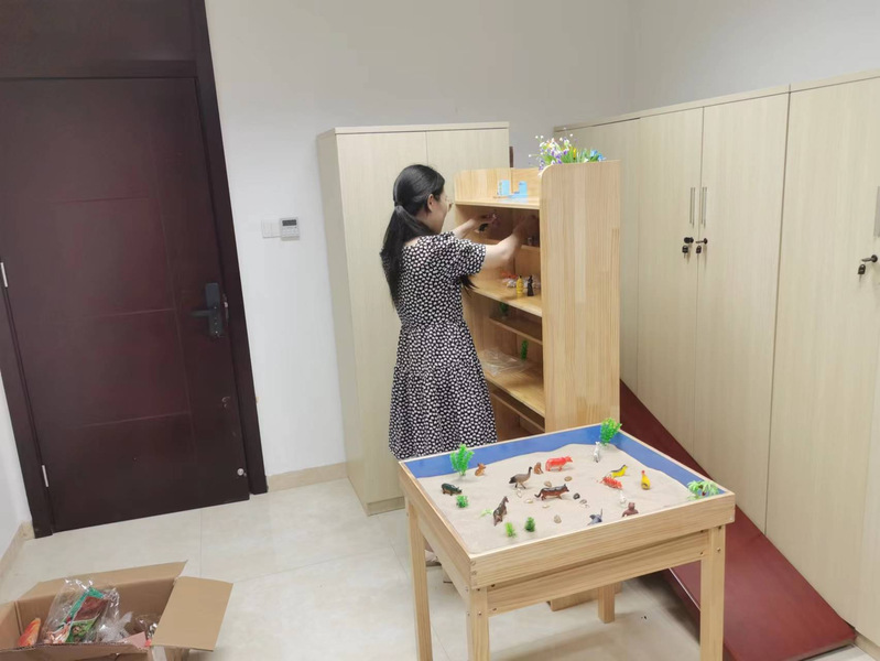 目前,淮海農場社區(qū)民政辦正緊鑼密鼓的建立服務流程和日常管理需要的各類制度,建立健全困境兒童臺賬和活動臺賬,預估10月底前,“淮海農場未成年人保護站”的各項設施完善配置,并正式開放。圖為社區(qū)民政辦工作人員正布置心理咨詢室設施。