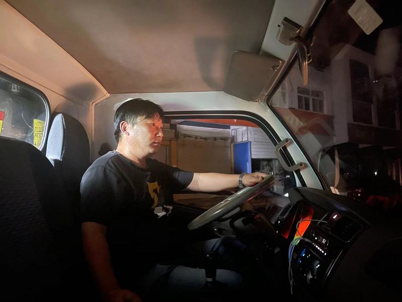 一個點一個點跑,一桶一桶裝,一車一車卸。戴玉剛對每個清運點的位置熟悉得不能再熟悉,一天作業(yè)下來能跑40多公里。當(dāng)車?yán)锢幚硗戤叄麄冇珠_始洗車刷車……等到都弄干凈了才回家吃點東西,再睡上一覺。