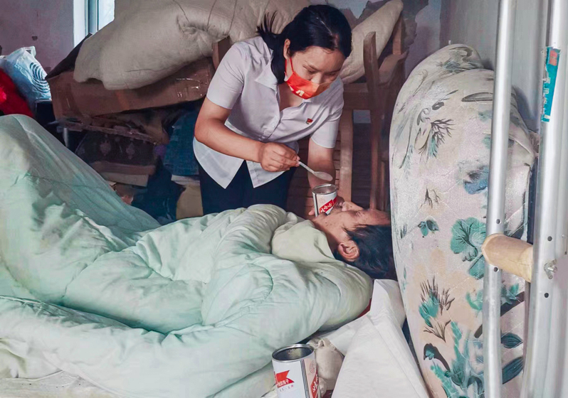 云臺農場張圩居委會所轄小糧地居民點,地理位置偏僻,是個只有5 戶人家的待撤并村莊。2022年8月9日,在“四個百”活動日常走訪中,當居委會走訪到小糧地居民點曹子牛家時,發(fā)現(xiàn)昏暗的房間內陣陣異味撲鼻而來。獨居在此的居民曹子牛,因起夜從床上不慎跌落在地,造成意識模糊講不出話來,大小便失禁,生活無法自理,成了一名“失能人”。作為居委會的幫扶對象,曹子牛一直是村子里讓人頭疼的“老大難”。年輕時候的曹子牛常年游手好閑、酗酒成性,喝多了就家暴妻子孩子,2010年、2018年,他先后兩次因為酒駕摔傷,導致左腿粉碎性骨折、腰部受傷,妻子頭部嚴重受傷。厄運接踵而至,讓妻兒無法忍耐,先后離開了家。由于他平日的言行,加之親屬能力有限無人愿意照料他,這給張圩居委會黨支部書記徐洪敏出了一道大難題,這燙手的山芋到手了就沒有丟掉的道理,徐書記沒有絲毫的猶豫,她立即成立了以她和居委會黨支部委員段萬江同志、小糧地轄區(qū)網(wǎng)格單元長顧林國同志為成員的專項幫扶小組,第一時間為曹子牛送去了米、面、水、雞蛋、八寶粥、隔尿墊、尿不濕等食物和生活必需品,并看守照料曹子牛。照料這樣的失能人難度可想而知,而這位90后女書記愿意帶著大家干這種又臟又累伺候人的活,更是難以想象!面對滿屋的異味,她連眉也沒皺一下,不嫌臟、不怕累,帶領幫扶小組上前給曹子牛喂水、喂藥、喂飯,處理他的大小便,換洗床鋪,打掃房間,真正將群眾視為自己的親人去照料,去愛護。照料曹子牛生活的同時,她也沒有停止為曹子牛爭取援助的腳步。她積極聯(lián)合轄區(qū)派出所和有關部門,想方設法聯(lián)系他的親屬,苦口婆心的勸說,幫助協(xié)調矛盾糾紛,積極申請民政救助,聯(lián)系海州區(qū)殘聯(lián)上門幫助他評殘,為曹子牛申請重殘補助,讓曹子牛真真切切地感受到黨的關懷。