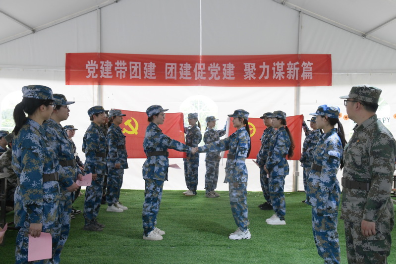 5月13日,淮海農場有限公司黨委和團委開展“黨建引領、團建賦能、凝聚青春奮斗力量”主題活動,近50名40周歲以下青年員工來到連云港云水灣拓展基地,開展戶外拓展活動。圖為青年員工在開展“黨建帶團建 團建促黨建 聚力謀新篇”黨團員結對儀式。