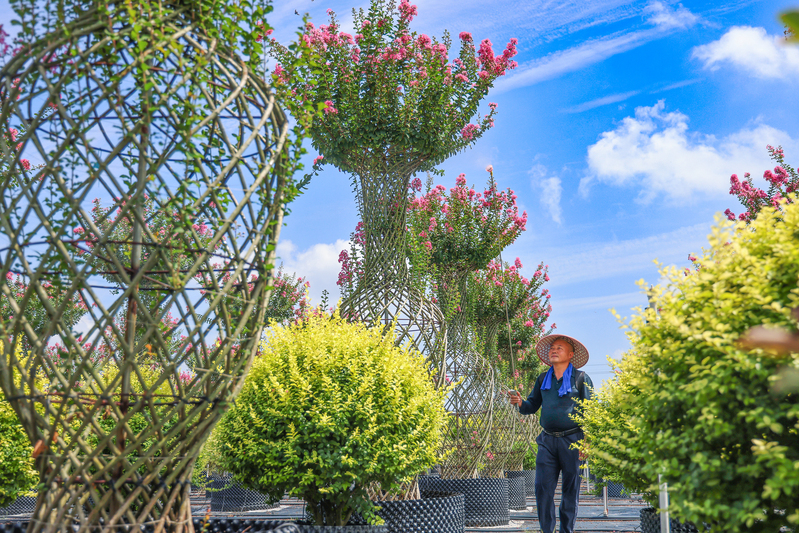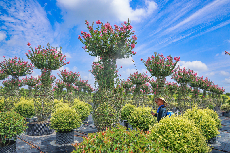 8月14日,在江蘇省鹽城市射陽縣,江蘇農墾新洋農場容器苗項目基地,管理人員正在養護紫薇花瓶。近年來,新洋農場利用容器苗基地優勢,在栽培方式上大膽嘗試,通過扦插培育,實現了自繁自育栽培技術的新突破,容器栽培的模式使苗圃成活率更高、綠化效果更好,優良的品質廣受全國各地綠化項目方的青睞。