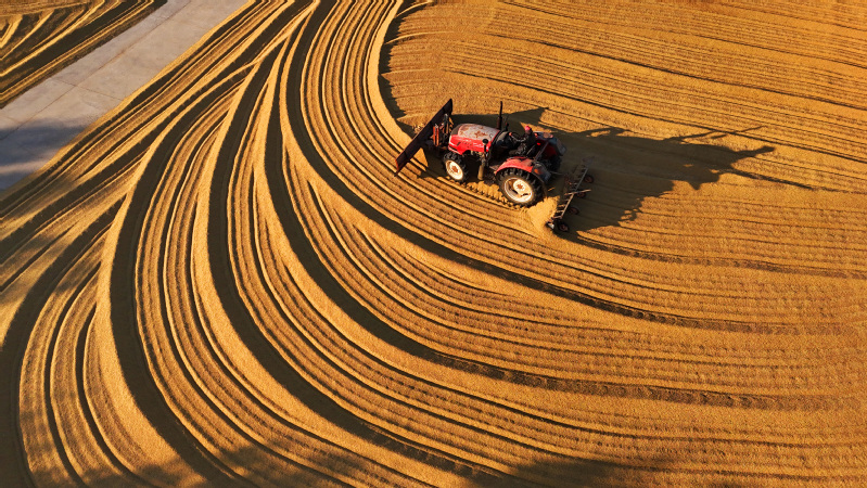 江蘇省連云港市海州區云臺農場工作人員搶抓晴好天氣翻曬稻谷(10月28日攝,無人機照片)。“新筑場泥鏡面平,家家打稻趁霜晴?!苯鹎飼r節,各地迎來豐收季,農民抓住晴好天氣收割收獲晾曬谷類作物,田間地頭呈現一派忙碌的豐收景象。新華社發 耿玉和 攝