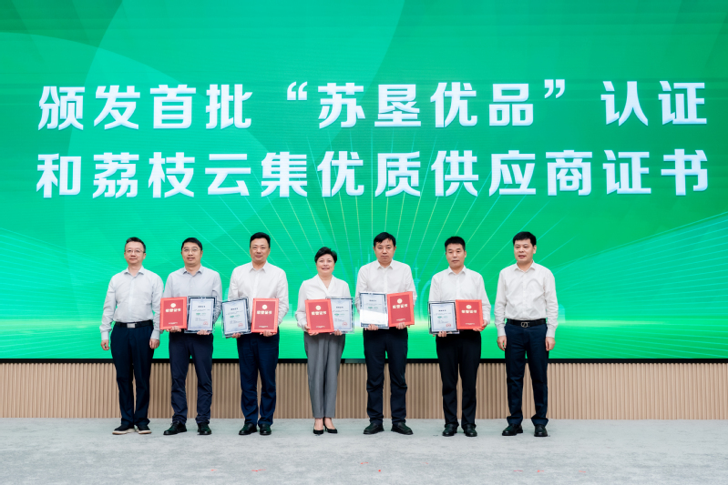 現(xiàn)場還舉行了“蘇墾優(yōu)品”認證證書及“荔枝云集優(yōu)質供應商”證書頒發(fā)儀式。江蘇省農(nóng)墾米業(yè)集團有限公司、蘇州蘇墾現(xiàn)代農(nóng)業(yè)發(fā)展有限公司、金太陽糧油股份有限公司、江蘇農(nóng)墾漁業(yè)科技有限公司、江蘇農(nóng)墾乳業(yè)科技有限公司五家企業(yè)獲得首批授權。