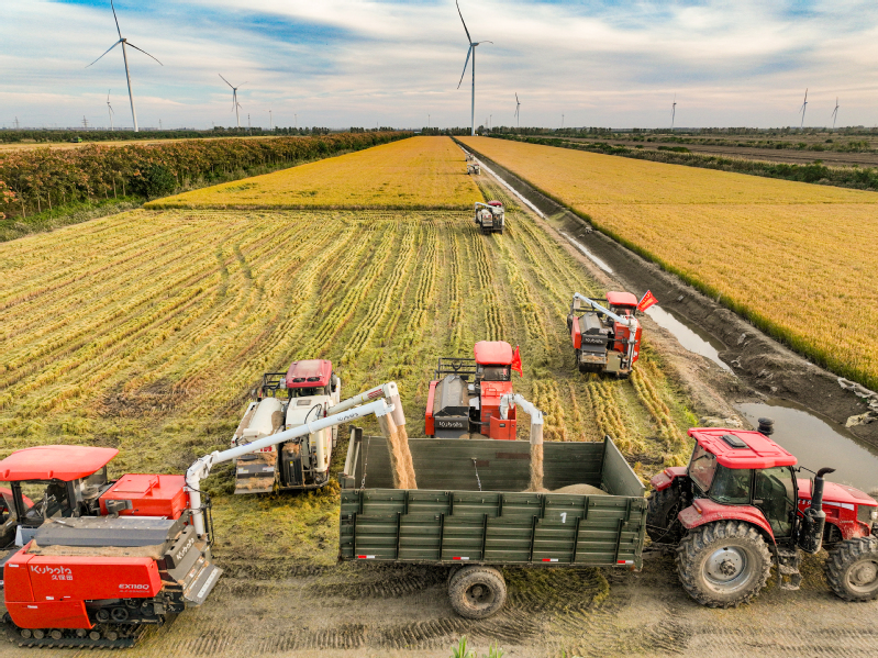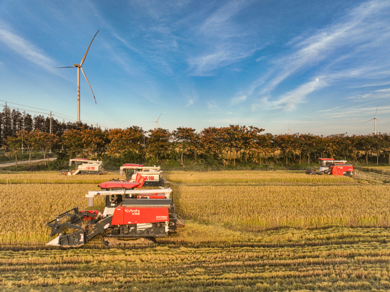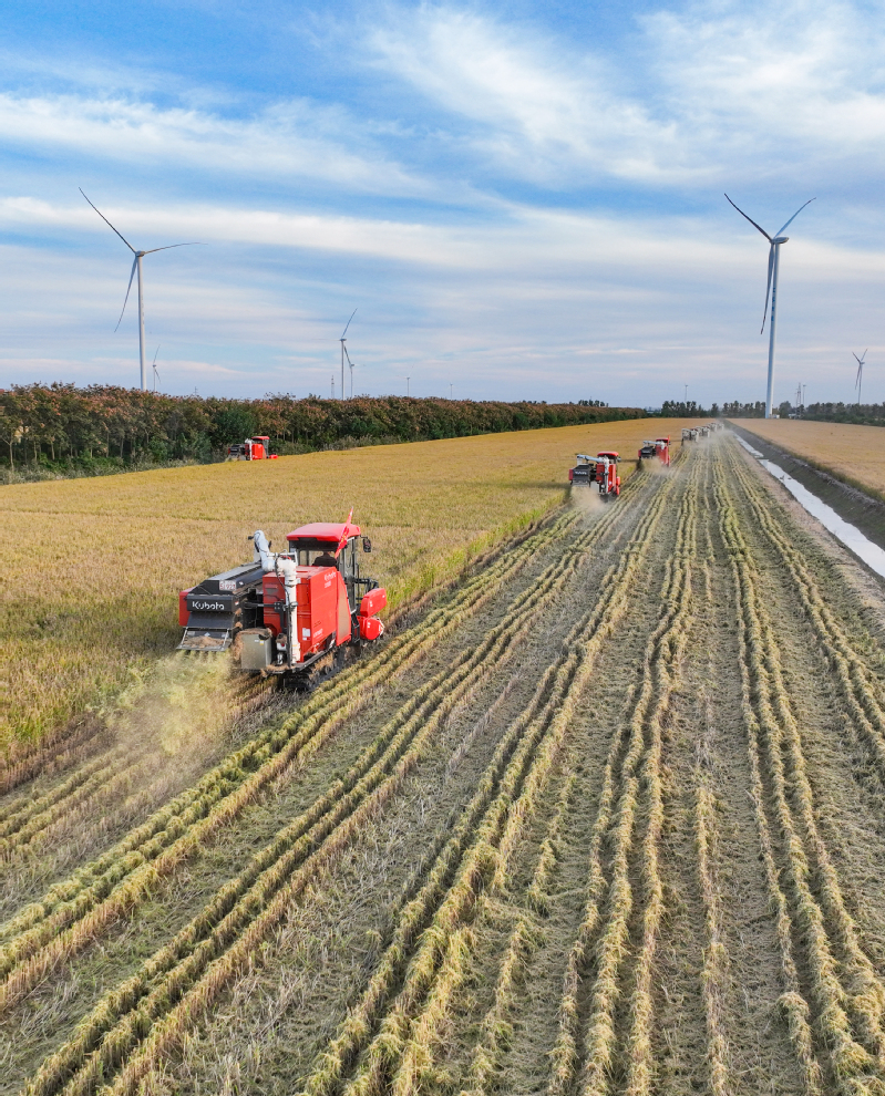11月3日,江蘇省鹽城市射陽縣新洋農(nóng)場(chǎng)組織收割機(jī)械,對(duì)高標(biāo)準(zhǔn)農(nóng)田中的優(yōu)質(zhì)水稻進(jìn)行搶收作業(yè),確保秋糧顆粒歸倉,不誤農(nóng)時(shí)。   作者:張偉生