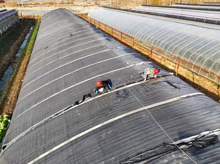 “把保溫膜拉得緊一些,主要是接縫處要全部覆蓋,否則影響保溫效果。”12月1日,在園區的12號溫室大棚,工作人員楊維祥和竇雙雙正在修復破損的外保溫被。“百合花遇到寒冷天氣也會‘感冒’,必須營造良好的室內溫度。”楊維祥一邊固定保溫棉被一邊介紹,保溫棉被不僅能夠減少熱量的散失,還能保持土壤濕度,為大棚百合花創造相對穩定的生長環境。為保證保溫效果,他們還特別注意保溫棉被的覆蓋密度和固定方式,確保大棚里的百合花都能平穩抵御低溫。