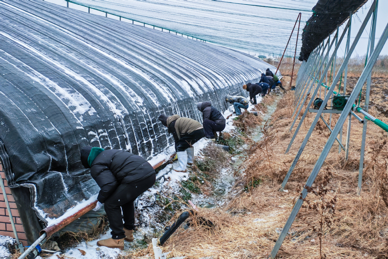 面對大風和積雪壓力,設施結構的穩固是第一道關卡。“一、二、三!大家不要松手,再加把勁?!?月18日一大早,為應對寒潮,高效農業示范園第一時間組織人員對園區內所有大棚進行全面加固。同時,對保溫棉被進行檢修和更換,確保其保溫性能處于最佳狀態。同樣,在云臺農場云水灣景區,技術團隊也提前完成了所有生產大棚的結構檢查與加固,重點提升設施的物理抗逆能力,云水灣景區負責人崔婷婷介紹道,“所有棚室的通風口均已提前密封,并儲備了充足的專用保溫被,用于夜間覆蓋以有效蓄熱。例如在藍莓種植區,我們特別采取了‘雙層覆膜+加厚保溫被’的強化方案,全力鎖住溫度。工作人員也加強了監控和維護,確保農作物的健康生長。”