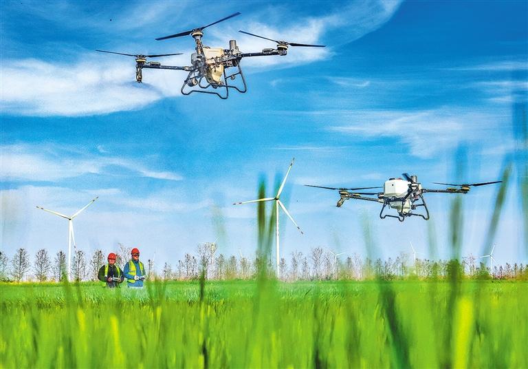 4月7日,在江蘇省鹽城市射陽縣,江蘇農(nóng)墾新洋農(nóng)場的農(nóng)技人員操作無人機開展春季田管作業(yè)。當前,正值春季田管關(guān)鍵時期,該農(nóng)場通過智能化作業(yè)做好田間作物管理,為夏糧豐收打好基礎(chǔ)。張偉生攝(中經(jīng)視覺)