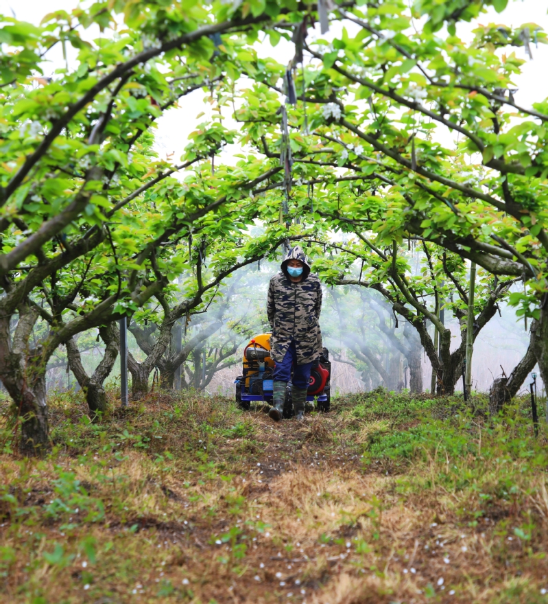 4月11日,在江蘇省南通市海門區的江蘇農墾江心沙農場,果農針對當前幼蟲體群集、裸露、不耐藥,病菌初侵染,葉片尚小等特性,搶抓防治最佳時機,操作自走式噴霧機在梨園里往返穿梭進行噴防作業。