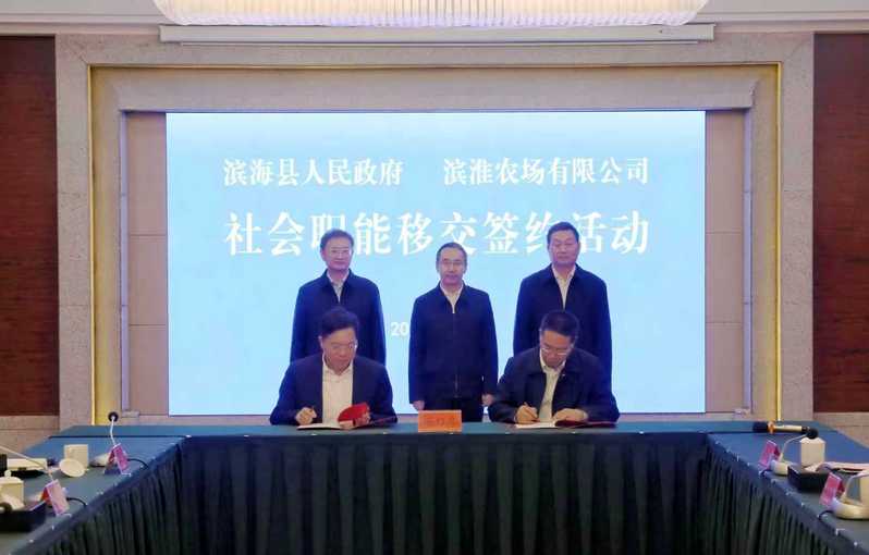 10月24日上午,濱淮農(nóng)場社會職能移交簽約活動在濱海舉行。集團(tuán)黨委書記、董事長吳本輝,濱海縣委書記吳啟標(biāo),集團(tuán)黨委委員、副總經(jīng)理劉衛(wèi)華,總經(jīng)理助理姚海洪,濱海縣副縣長李品出席簽約活動。濱海縣政協(xié)主席王海榮主持活動。吳本輝表示,推進(jìn)企業(yè)辦社會職能改革,是新一輪國企改革的重要接續(xù)工作。濱淮實(shí)現(xiàn)農(nóng)場辦社會職能移交屬地管理,是雙方互信互利互贏的重要成果,也標(biāo)志著墾地融合發(fā)展邁出堅(jiān)實(shí)步伐。濱淮農(nóng)場要切實(shí)強(qiáng)化責(zé)任意識,加強(qiáng)與濱海縣委、縣政府的溝通匯報(bào),有力有序推進(jìn)各項(xiàng)社會職能的移交工作。吳本輝指出,近年來,濱海縣錨定經(jīng)濟(jì)指標(biāo)“總量靠前、增幅領(lǐng)先”、總體位次“沖刺全市第一方陣”的目標(biāo),以滿格狀態(tài)主動作為、勇挑大梁,持續(xù)放大區(qū)位、產(chǎn)業(yè)、資源、生態(tài)等優(yōu)勢,經(jīng)濟(jì)社會發(fā)展呈現(xiàn)出高歌猛進(jìn)、勢頭十足的良好態(tài)勢。當(dāng)前,江蘇農(nóng)墾正在深化落實(shí)“三大建設(shè)”,全力支持所屬農(nóng)場融入地方發(fā)展,培育壯大特色產(chǎn)業(yè)。希望以此次簽約為契機(jī),進(jìn)一步發(fā)揮墾地產(chǎn)業(yè)鏈協(xié)同優(yōu)勢,推動資源高效整合、深度融合,共同培育特色鮮明的農(nóng)業(yè)產(chǎn)業(yè)集群,打造墾地融合的“濱海樣板”,為推動沿海地區(qū)高質(zhì)量發(fā)展、助力江蘇農(nóng)業(yè)現(xiàn)代化走在前作出新的更大貢獻(xiàn)。吳啟標(biāo)代表