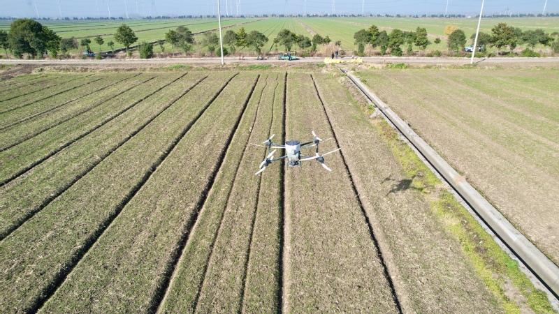 當前,正是小麥冬季管理的重要時期,連日來,蘇墾農發復興圩分公司各生產大隊,搶抓晴好天氣,全面積使用植保無人機,抓好在田小麥補肥促壯工作,提高小麥冬管質量,確保小麥安全越冬。12月6日下午,在農業生產三大隊田間,綠油油的麥苗長勢喜人,十多名農業生產管理人員在田頭緊張有序忙碌,運肥、上肥、施肥,大家協同分工、緊密配合。伴隨著呼隆隆的引擎聲,一臺臺植保無人機陸續起飛,在操作人員的控制下按照設定好的路線,進行小麥施肥作業?!案鶕鞖忸A報顯示,近期有雨水天氣,我們組織人員和機械趕在雨前追施壯蘗肥,提高肥效,促進苗情轉化,為小麥拔節期施好穗肥早做準備,達到促分蘗、保穗數、增粒重的效果?!狈止巨r業綜合服務中心負責人介紹說道。使用植保無人機進行施肥作業,有效提升了農業生產效率,每臺無人機每天能夠完成800多畝作業面積。據悉,復興圩分公司計劃三天內全面完成2萬畝小麥施肥作業。下一步,復興圩分公司將根據天氣變化持續抓好小麥冬管,做好清溝理墑工作,做到及時清溝,確保灌排通暢,提高抗災保豐收能力,為明年夏糧豐產豐收打好堅實基礎。