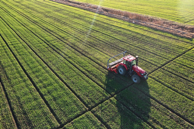 連日來,蘇墾農發崗埠分公司認真做好小麥苗期管理工作,堅持“一田一策”,分類管理。圖為在崗埠生產區,農機站改造好的播肥機在大田里給早苗播施分蘗肥,該播肥機將肥料通過機器直接播入土壤內部,實現精量施肥并減少肥料損耗。