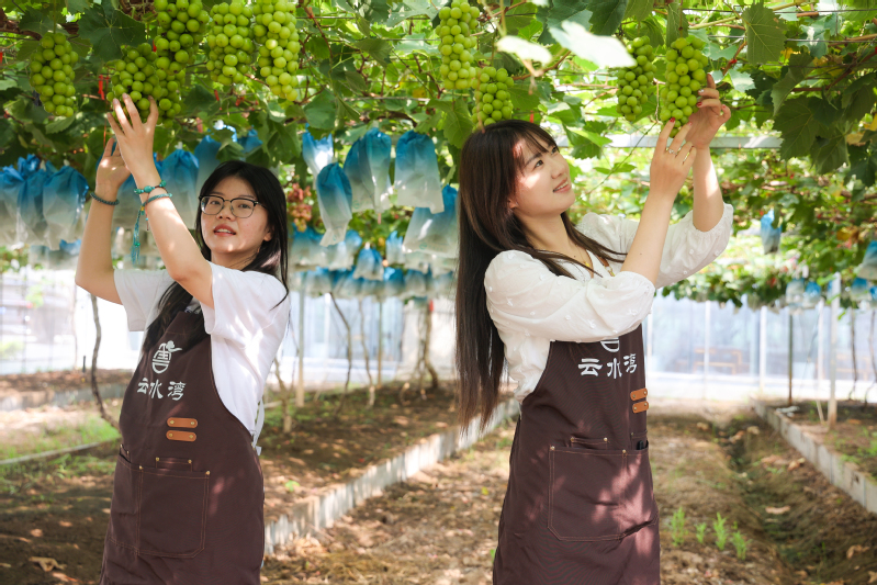 時值盛夏,云臺云水灣濕地公園的葡萄園迎來大豐收。一串串長勢喜人、大小勻稱的葡萄像黑珍珠一樣掛滿枝頭,微風吹過,滿園清甜香氣撲鼻而來。翠綠的藤蔓下,工作人員正拿著剪刀、提著竹籃忙著采摘,一派豐收景象。